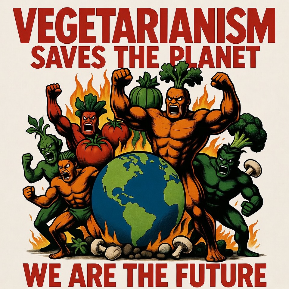 anthropomorphic, bodybuilder, bold text, broccoli, carrot, cartoon, clipart, earth globe, fierce expression, fire, flames, flexing, future, green hair, illustration, isolated background, muscular, mushroom, planet, pumpkin, save planet, strong vegetables, tomato, vegetables, veggies, vegetarianism