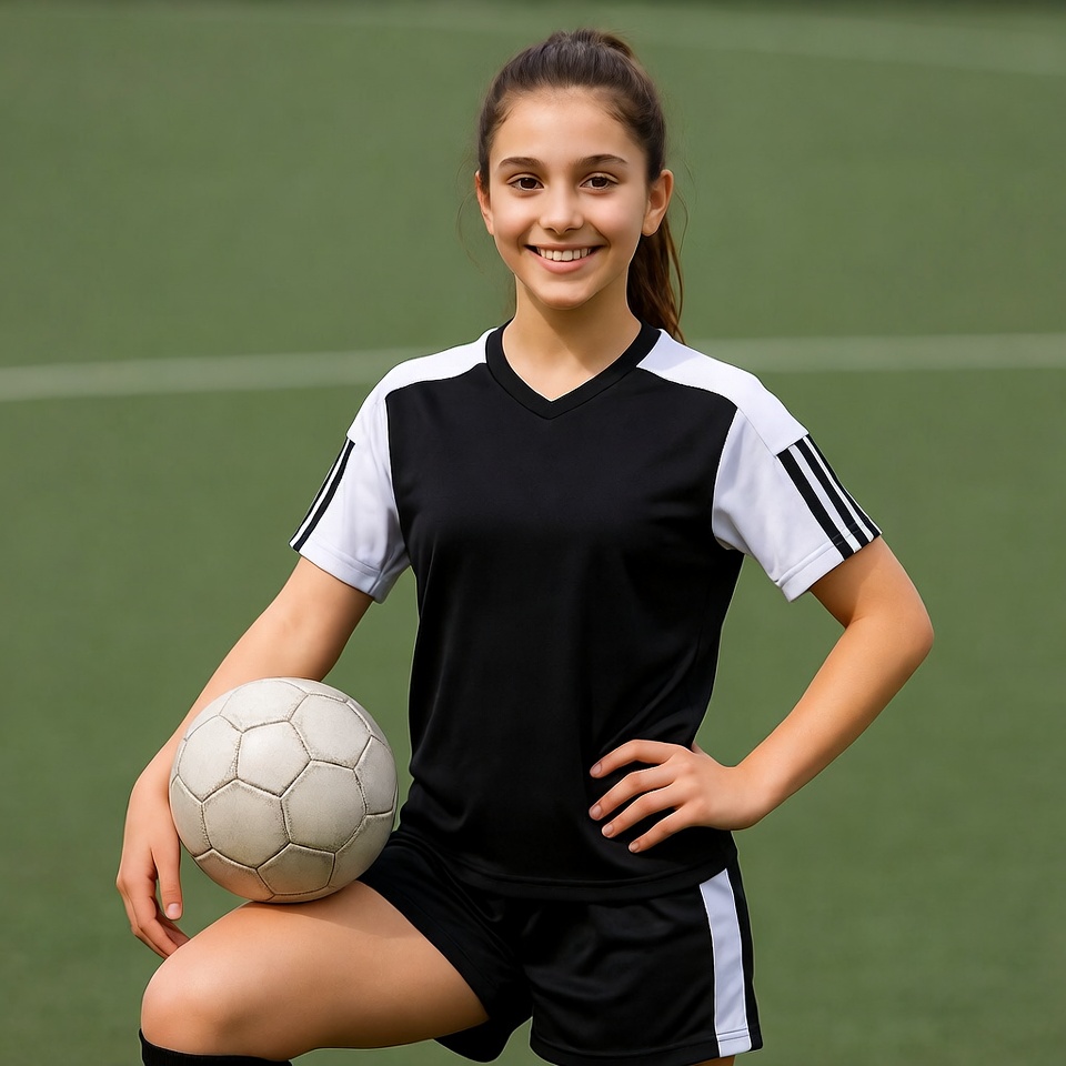 Adidas, athlete, black jersey, confident pose, dark hair, female, football, green field, hand on hip, isolated background, ponytail, shorts, smiling, soccer ball, soccer jersey, soccer player, soccer uniform, sports field, white stripes, young girl, girl