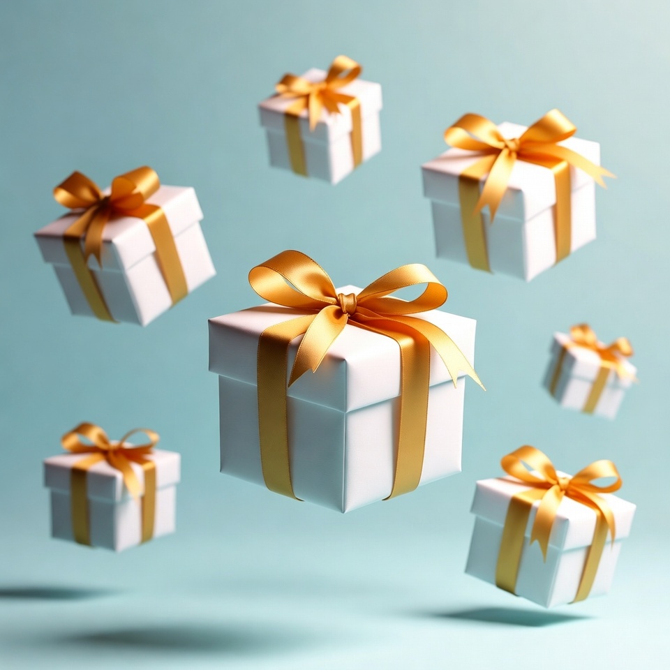 Multiple white gift boxes adorned with shiny gold ribbons float against a light blue background. The boxes are arranged dynamically in mid-air, creating a festive and celebratory visual effect. Each box features neatly tied bows in vibrant gold.