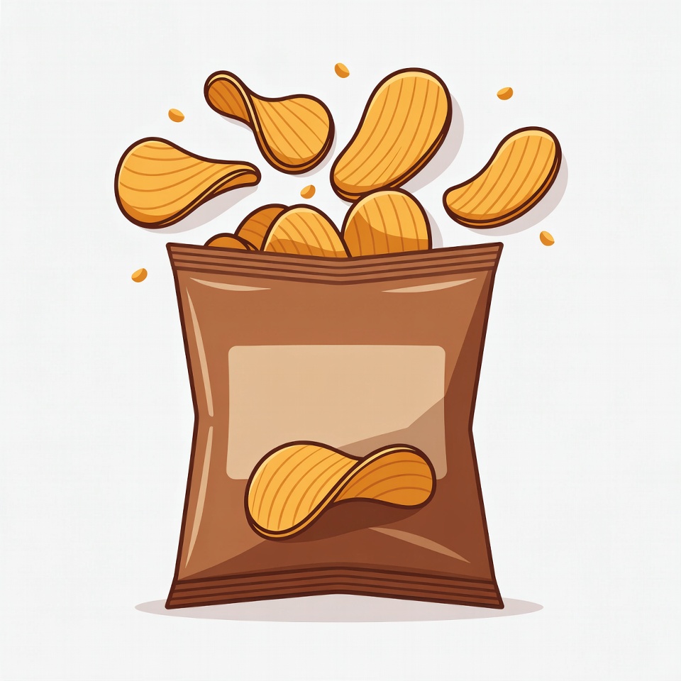 A colorful cartoon illustration shows a brown bag of potato chips with the top opened. Golden crispy chips are spilling out and flying around the bag. The chips have a detailed wavy texture, set against a white isolated background.