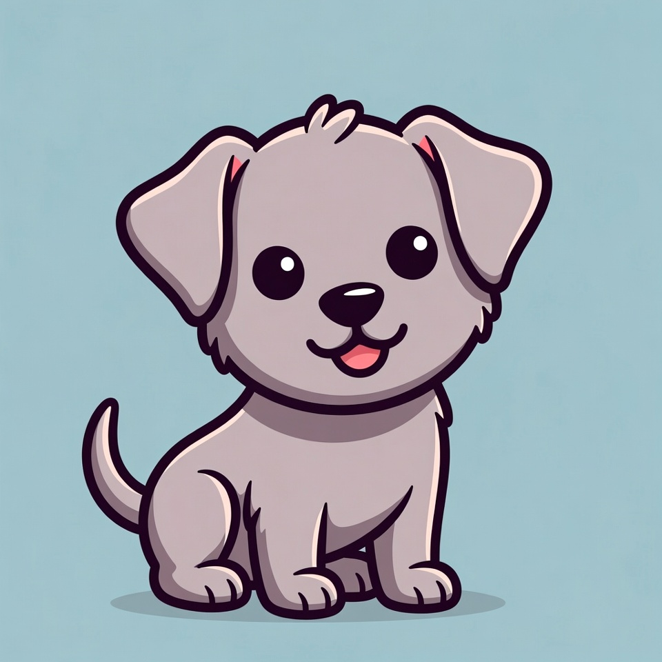 A cute cartoon gray puppy sits on a light blue background. The puppy has large sparkling eyes, a smiling mouth with tongue out, floppy ears, and a wagging tail. It features a simple, kawaii-style illustration with bold outlines.