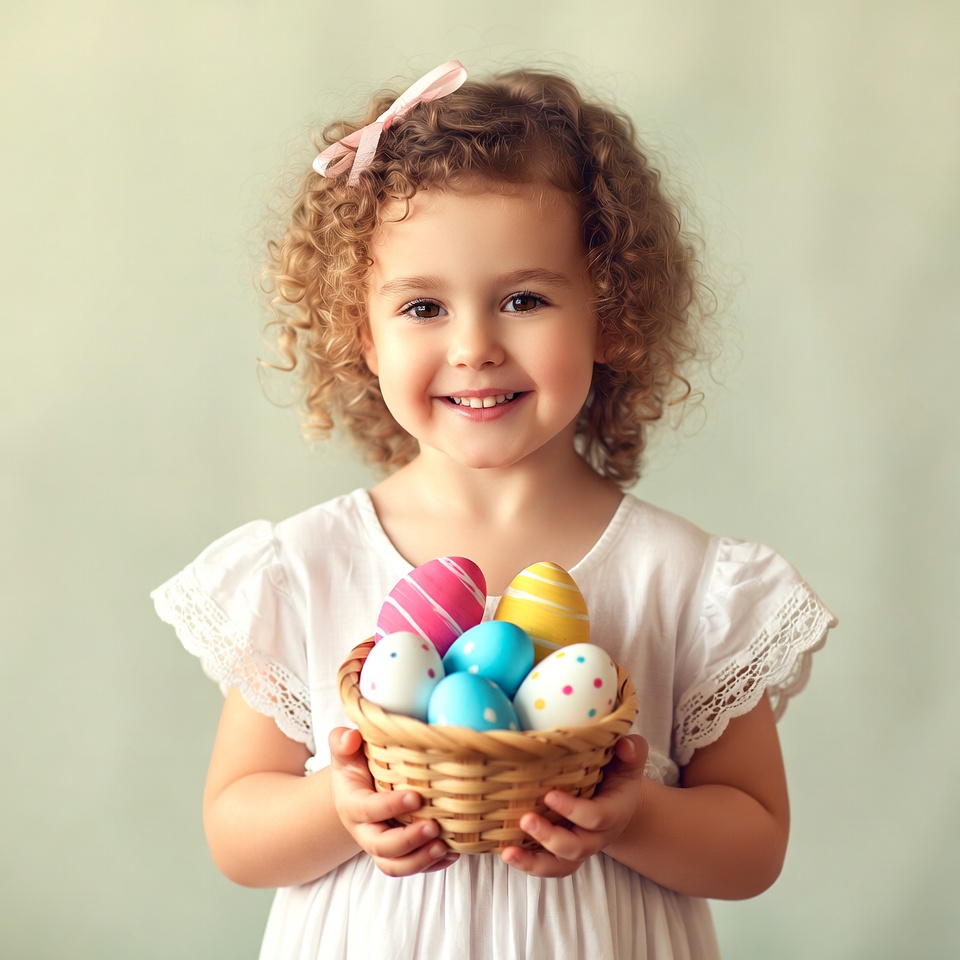 A young girl with curly brown hair and a pink bow smiles while holding a woven basket filled with colorful painted Easter eggs. She wears a white lace dress with short sleeves and stands against a light green background. The eggs feature vibrant colors like pink, blue, yellow, and polka dots.
