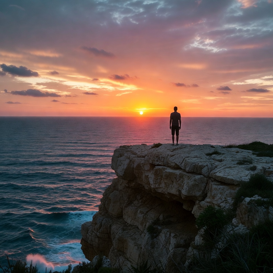 A silhouette of a man stands on the edge of a rocky cliff overlooking the ocean at sunset. The sky is filled with vibrant orange, pink, and purple clouds as the sun dips toward the horizon. Waves crash against the rocks below the cliff.