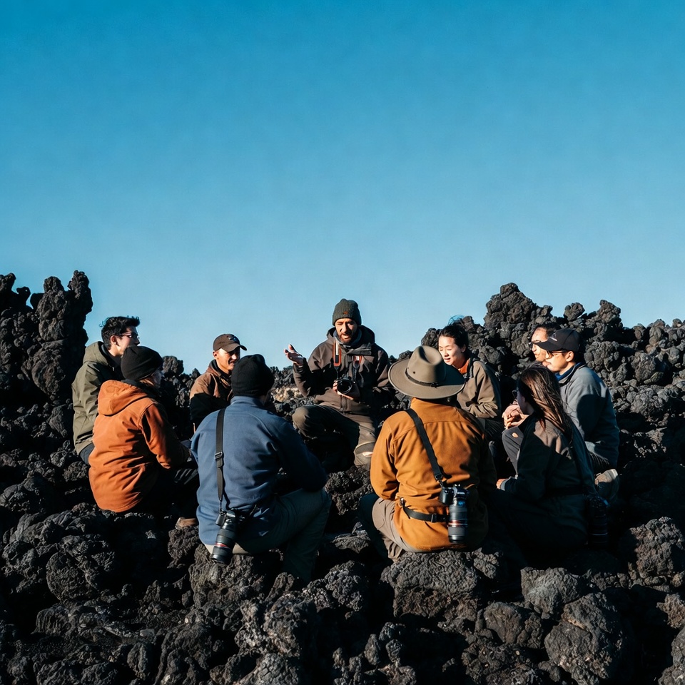 A diverse group of eight hikers sits in a circle on black volcanic rocks under a clear blue sky. One man in the center gestures while speaking, wearing a beanie and jacket, as others listen attentively in outdoor gear like jackets, hats, and camera straps. The rugged lava terrain surrounds them with no other elements visible.