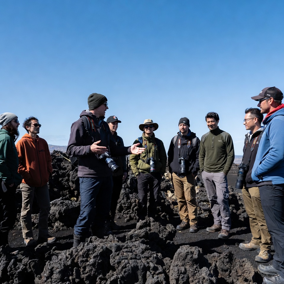 A group of men wearing outdoor jackets, hats, and backpacks stands on black rugged volcanic rock terrain. One man in the center gestures while holding a camera, speaking to the others under a clear blue sky. They appear to be on a guided tour or photography outing in a volcanic landscape.