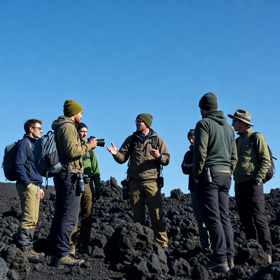A group of men wearing outdoor jackets, backpacks, and hats stands together on black rocky volcanic ground under a clear blue sky. One man in the center gestures while holding a camera, and others listen attentively around him. They appear to be on a guided tour amidst the rugged lava landscape.