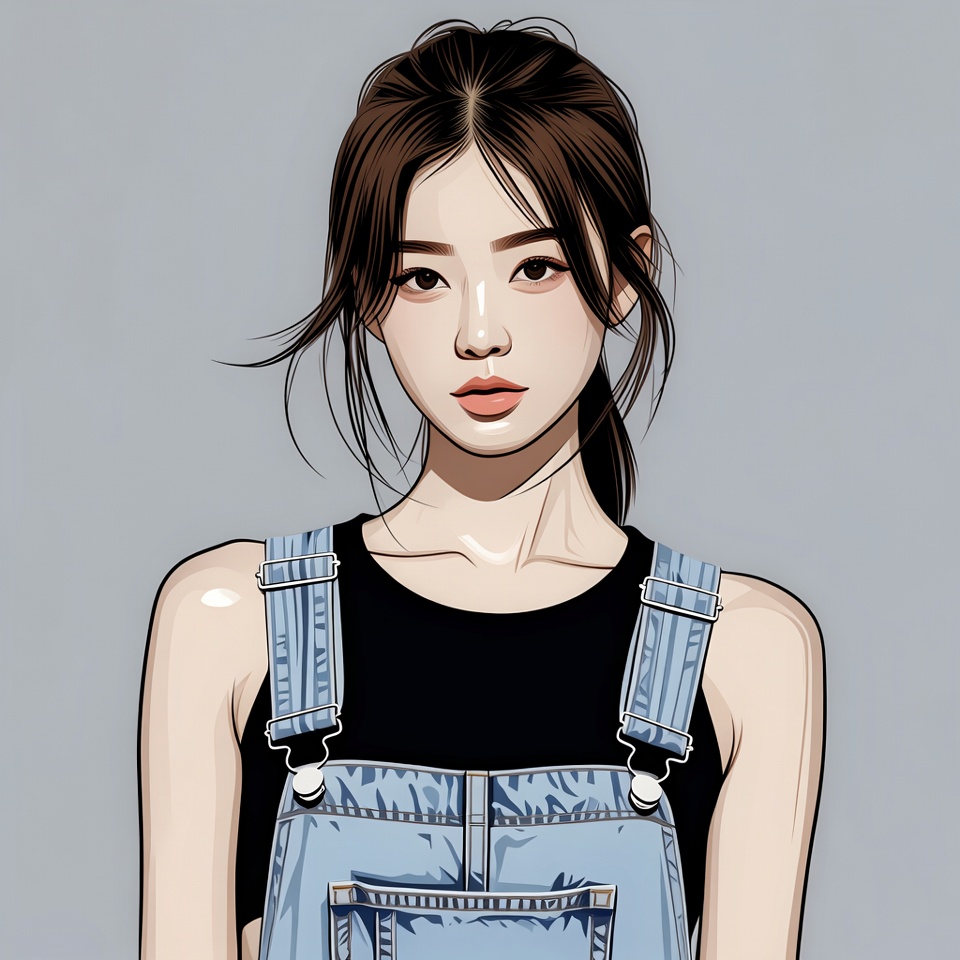 Digital illustration of a young Asian woman with long dark hair styled in a ponytail, facing forward on a gray background. She wears a black top under blue denim overalls with thin straps over her shoulders. Her expression is neutral with subtle makeup and windswept hair strands.