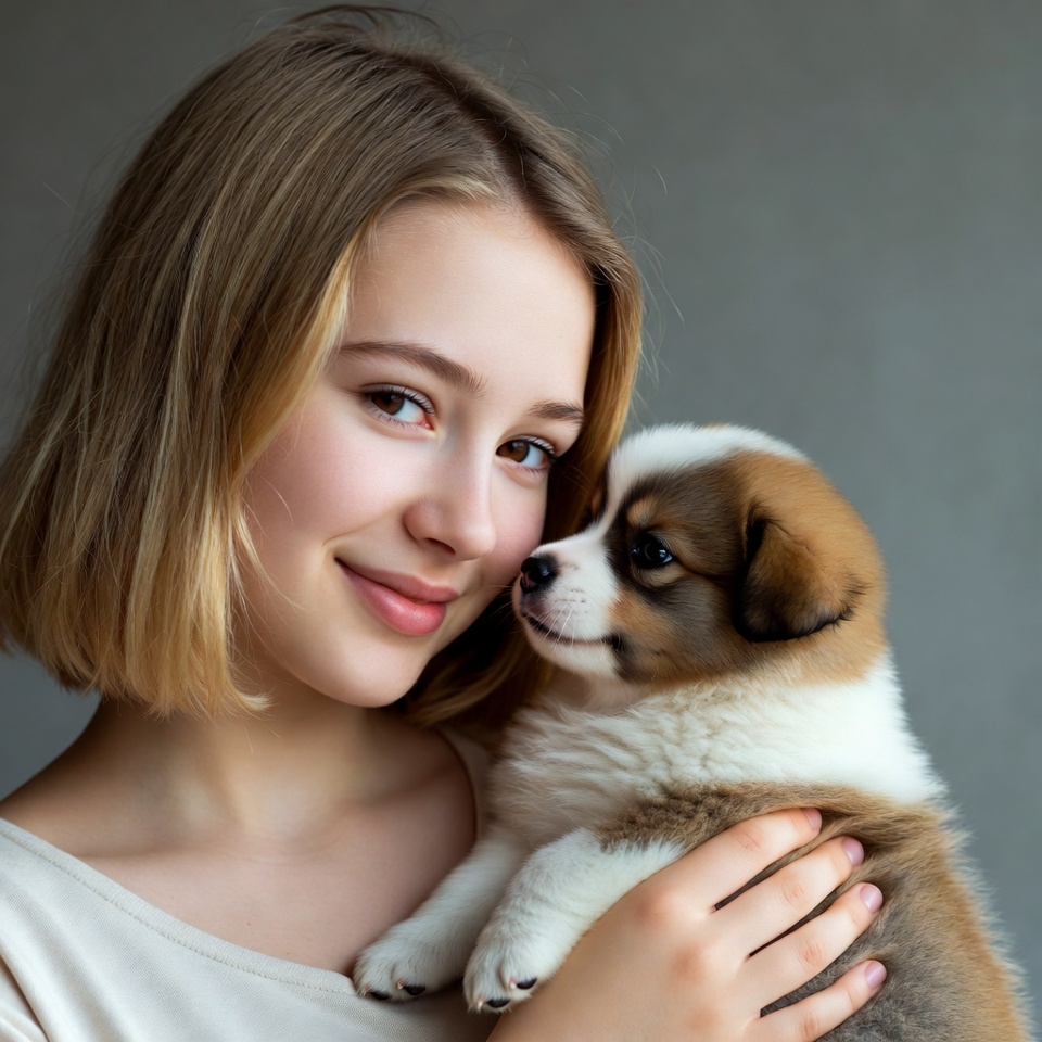 A young girl with blonde bob haircut smiles while holding a fluffy corgi puppy close to her face. She wears a plain white t-shirt and gazes affectionately at the brown and white puppy with large eyes. The image is set against a plain gray background.