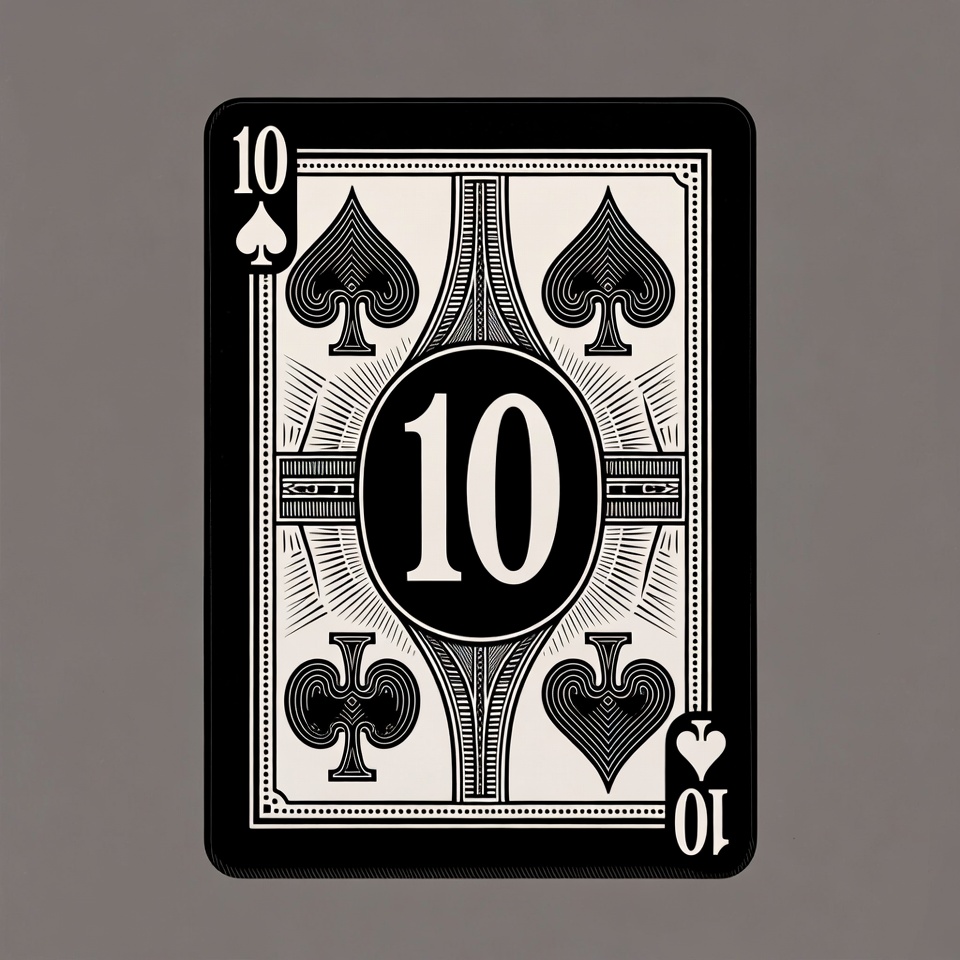 A classic ten of spades playing card features a black background with ornate white borders. Four prominent spade symbols are arranged in the corners, and a large central '10' is encircled by radiating lines and additional spades. The card has a vintage, illustrated design on a gray background.