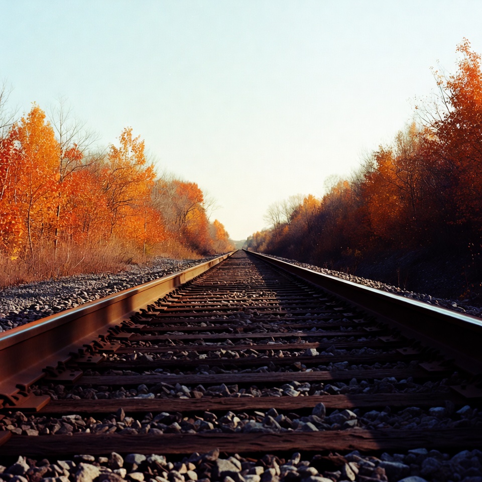 Railroad tracks extend into the distance flanked by vibrant orange and yellow autumn trees on both sides. The sky is clear and blue above the colorful fall foliage. Gravel lines the tracks under a serene autumn landscape.