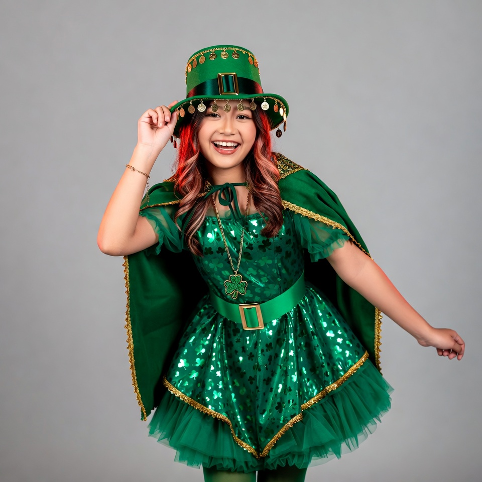 A young Asian girl with red wavy hair smiles brightly while wearing a green leprechaun hat adorned with gold coins and shamrocks. She dons a sparkling green dress with shamrock patterns, a matching green cape, and green tights, posing playfully on a plain gray background. Her hand lifts the brim of her hat, and she wears a green shamrock necklace.