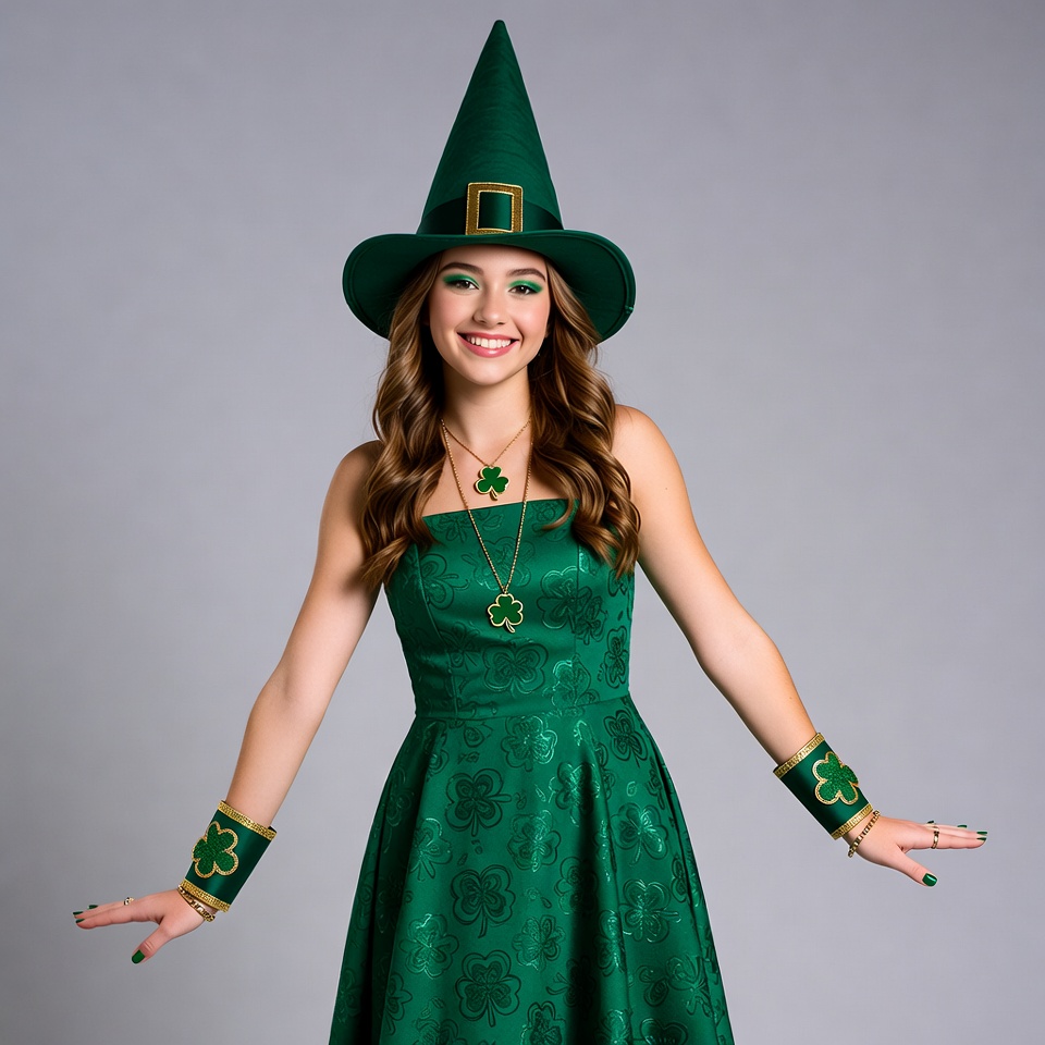 A young girl with wavy brown hair smiles while wearing a green witch hat and a shimmering green dress patterned with shamrocks. She has a green shamrock necklace and matching green cuffs on her wrists. Her arms are outstretched with hands posed against a gray background.