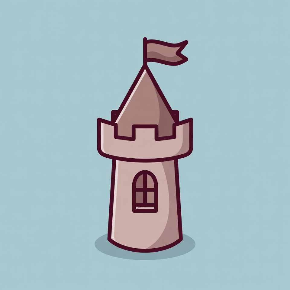 A simple cartoon illustration of a tall castle tower on a light blue background. The castle has beige stone walls, a pointed roof, a small window, and a brown flag waving from the top. It features clean line art with flat colors and a subtle shadow.