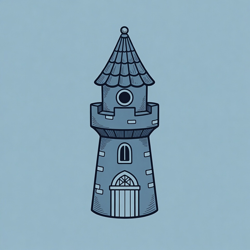 A hand-drawn cartoon illustration of a tall castle tower with blue tones on a light blue isolated background. The tower features a pointed roof with scales, a small circular window near the top, a rectangular window, and an arched wooden door at the base. Stone-like bricks form the cylindrical structure with battlements.