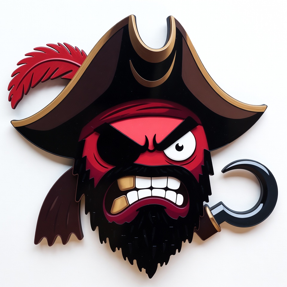angry face, black beard, brown hat, cartoon, clipart, emoji, eyepatch, fierce expression, hook hand, illustration, isolated background, pirate hat, red feather, red pirate, pirate