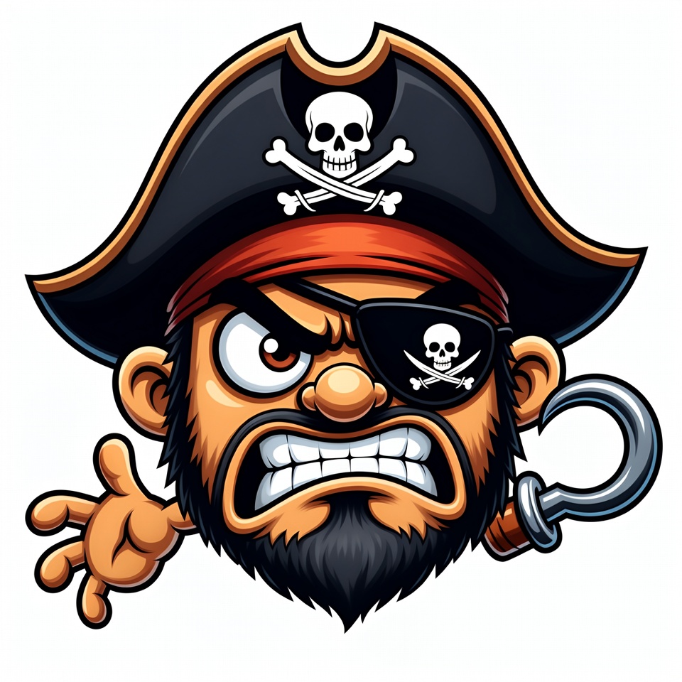A cartoon illustration of an angry pirate man with a black hat adorned with skull and crossbones. He has a red bandana, eyepatch, bushy black beard, and holds a metal hook hand while snarling fiercely. The vibrant, exaggerated style features on a white isolated background.