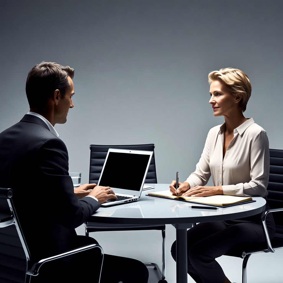 A man in a dark suit and a woman in a light blouse sit at a round glass table in a modern office. They face each other, typing on laptops and taking notes with pens. Black office chairs surround the table against a plain gray background.