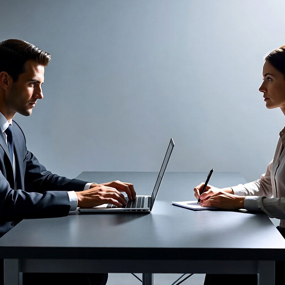A man in a dark suit types on a laptop while a woman in a light blouse writes on a notepad at a dark table. They face each other across the workspace on a plain gray background. Both appear focused on their tasks with professional attire.