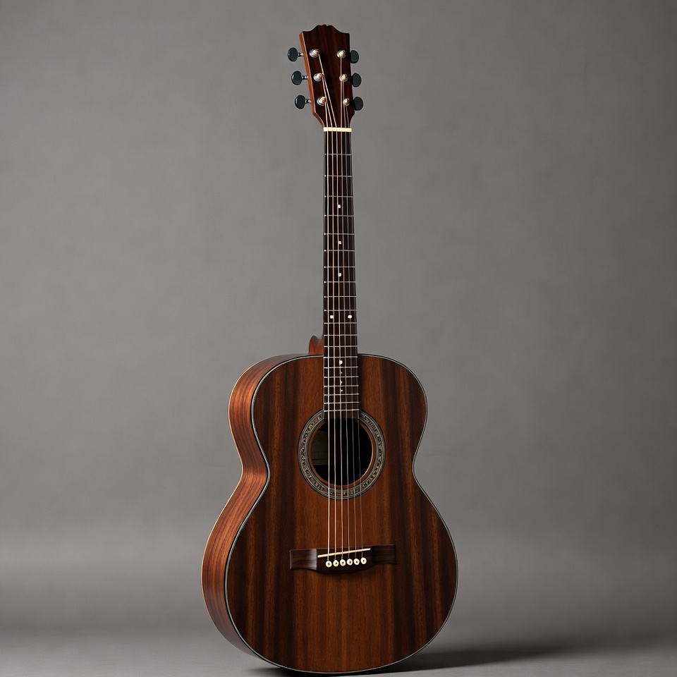 brown guitar, fretboard, gray background, guitar, isolated background, koa guitar, musical instrument, sound hole, strings, tuning pegs, upright guitar, wooden guitar, acoustic guitar