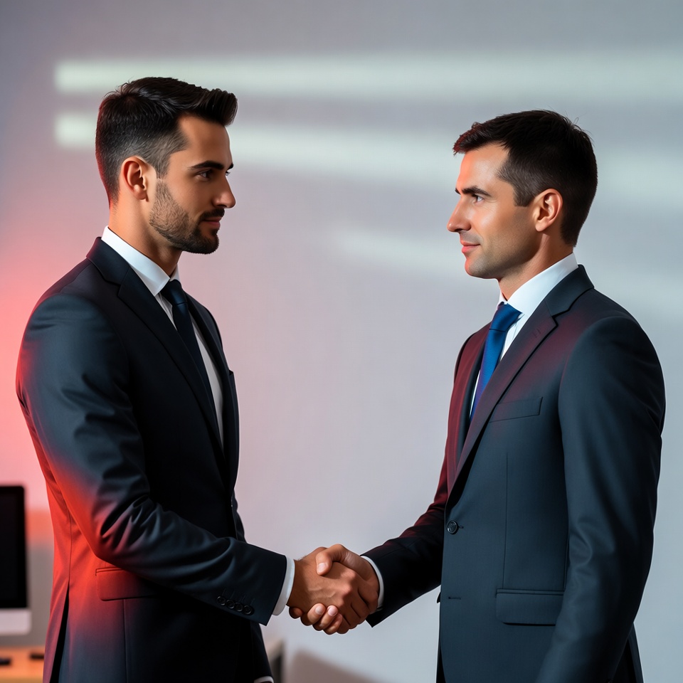 Two men in dark suits and ties shake hands firmly while facing each other. They stand against a plain gray background with subtle red lighting and office elements like a desk in the corner. Both have short dark hair, beards, and professional attire with white shirts.