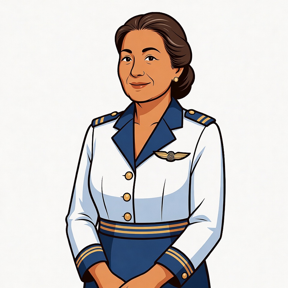 A cartoon illustration of an Asian woman with brown hair in a bun, smiling and standing with hands clasped. She wears a white uniform jacket with navy blue lapels, gold buttons, and a wing emblem. The figure is depicted on a plain white background.
