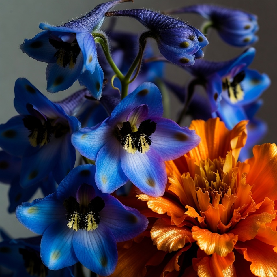 A cluster of vibrant blue delphinium flowers with dark centers stands prominently in the image. Several bright orange flowers with layered petals are positioned nearby, creating a striking color contrast. The flowers are set against a dark, isolated background with soft lighting highlighting their details.