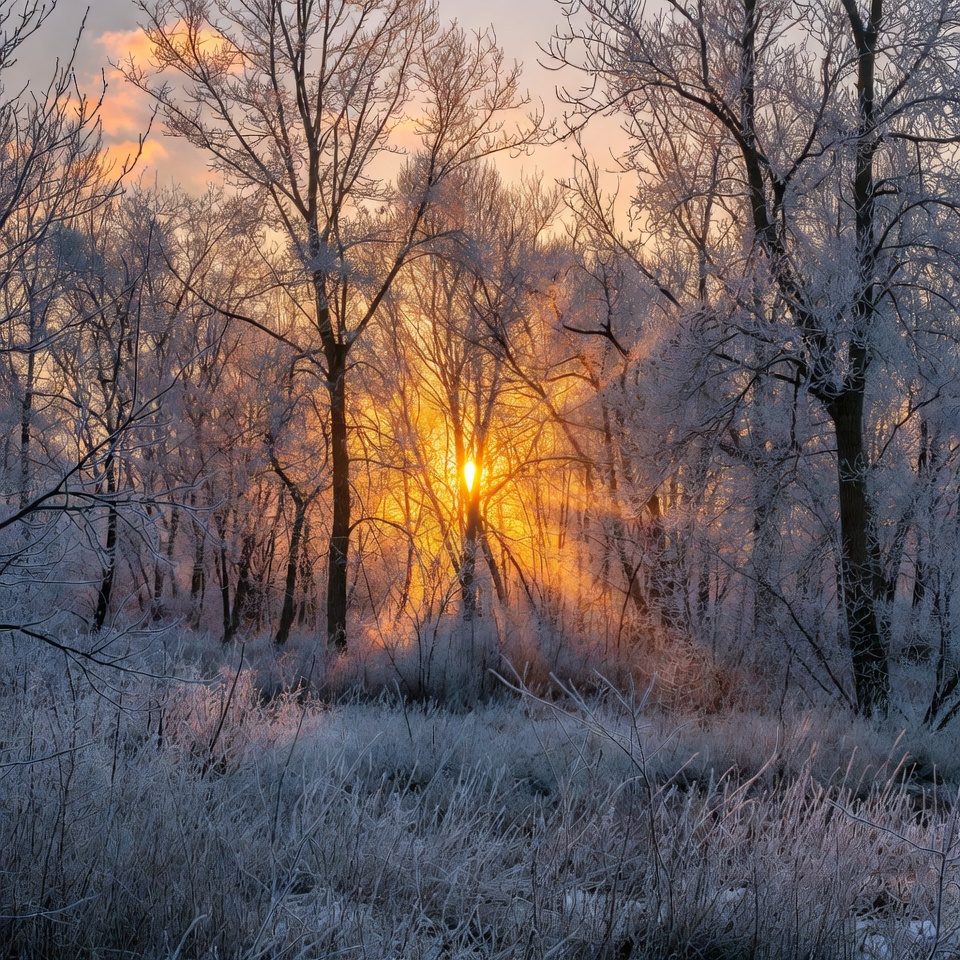 Bare trees covered in frost stand in a snowy field during sunset. Golden sun rays pierce through the branches, illuminating the icy landscape. The sky features scattered clouds in soft orange hues.
