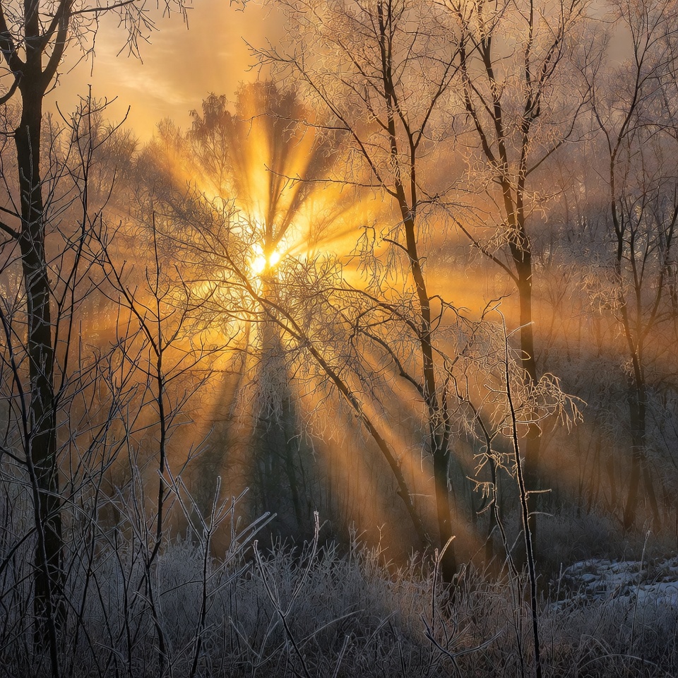 atmospheric, backlit trees, bare branches, cold weather, dawn, dusk, forest, frost, frosty trees, golden light, ice crystals, nature, outdoors, scenic view, snow, snowy trees, sun rays, sunset, warm sunlight, winter landscape, winter sunrise, sunrise