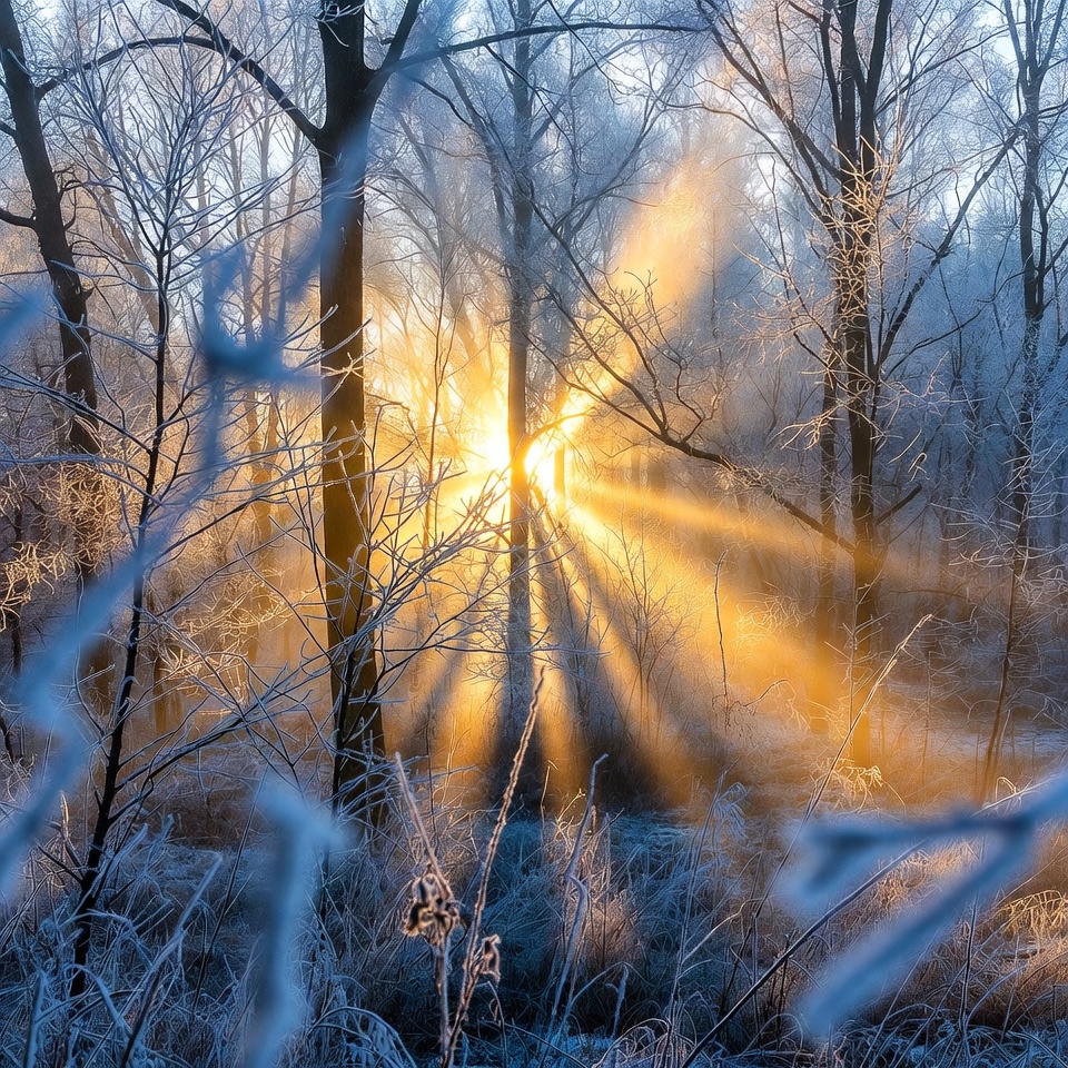 bare trees, cold weather, dawn, forest, frost, frosty trees, frozen trees, golden light, hoarfrost, icy branches, morning light, nature, outdoors, snow, sun rays, sunbeams, sunlight beams, winter landscape, woodland, winter sunrise
