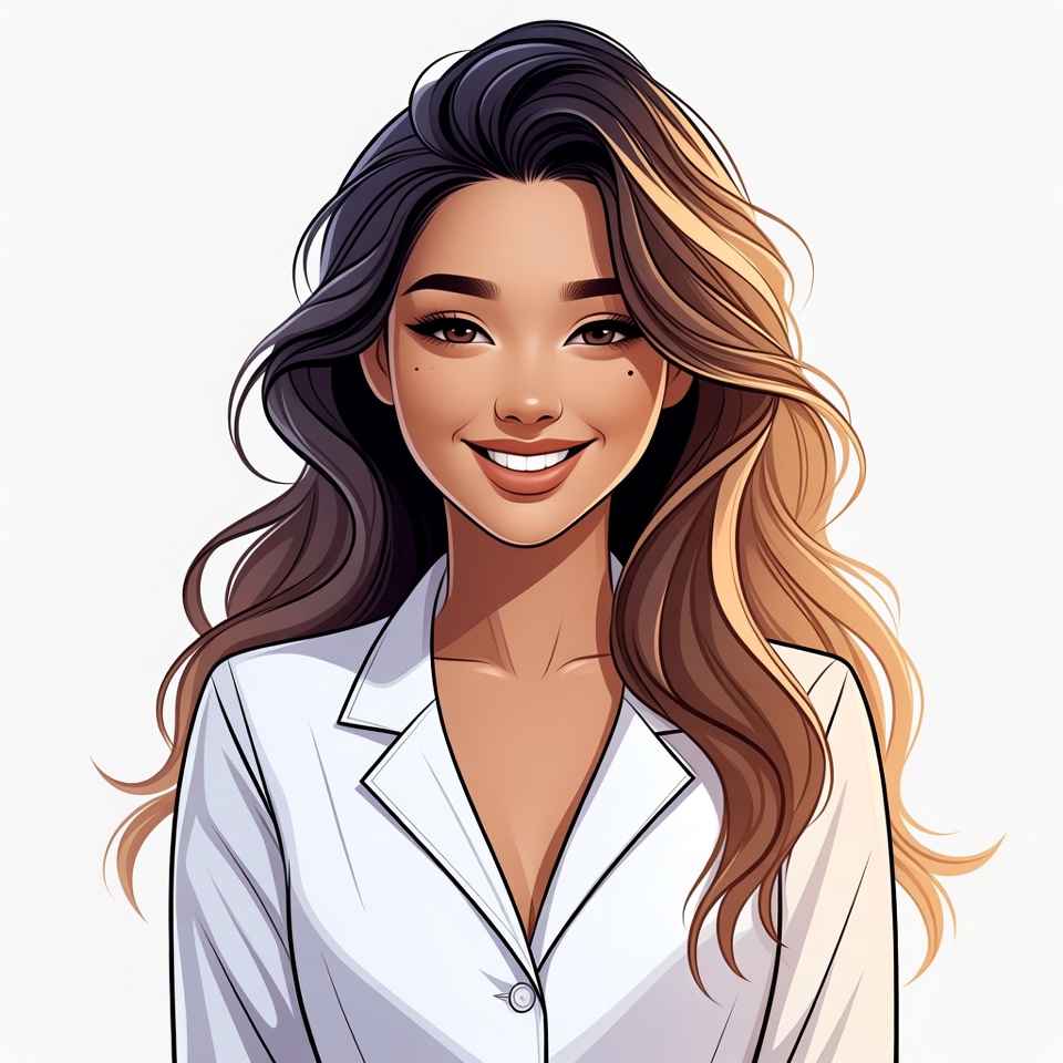 A beautiful Asian woman with long wavy dark brown hair highlighted with blonde streaks smiles warmly at the viewer. She wears a white collared blouse with buttons and has a smooth, illustrated style. The image features her face and upper body against a plain white background.