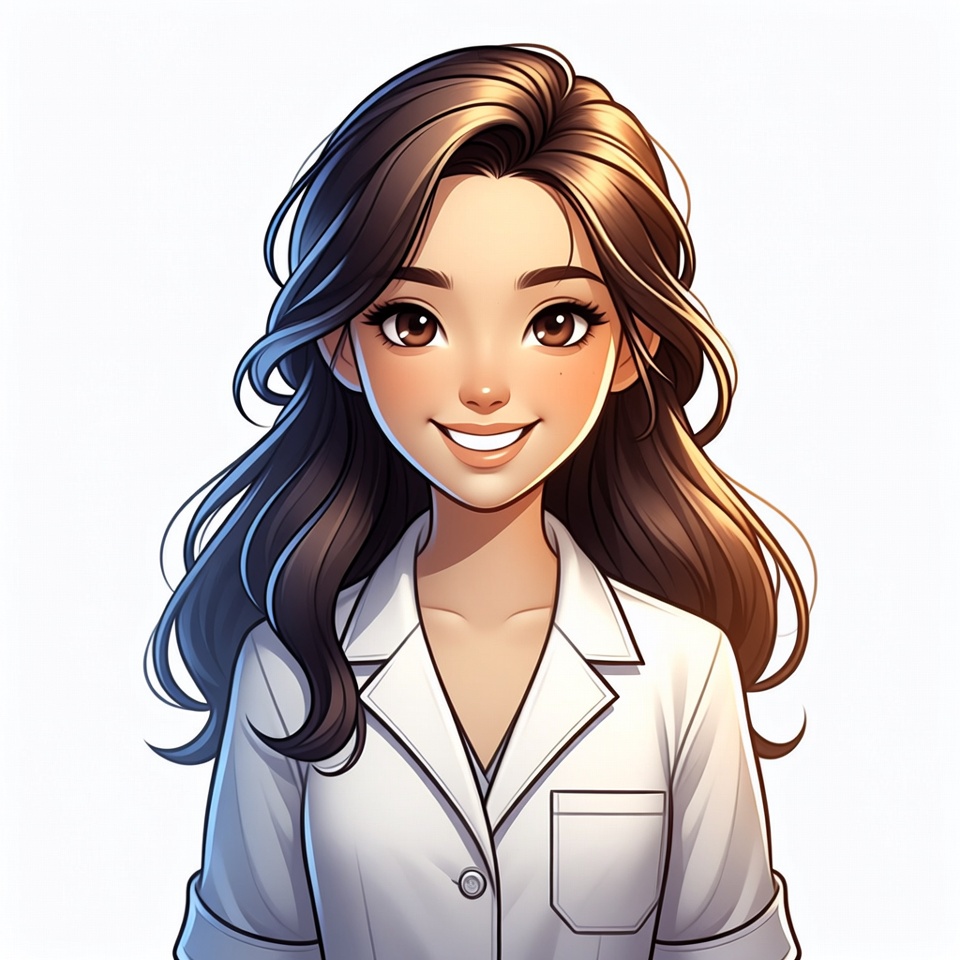 A young Asian woman with long wavy brown hair smiles warmly at the viewer. She wears a white lab coat with buttons and a pocket, styled in a detailed digital illustration. Her large expressive eyes and cheerful expression stand out against the isolated white background.