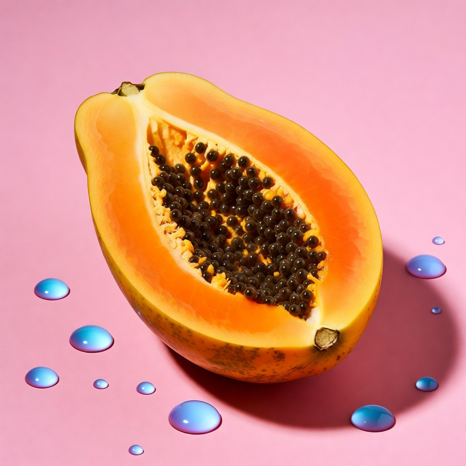 A ripe papaya fruit is sliced open, revealing orange flesh and numerous black seeds in the center. It rests on a vibrant pink background surrounded by scattered blue water droplets. The composition highlights the fruit's juicy texture and vibrant colors.