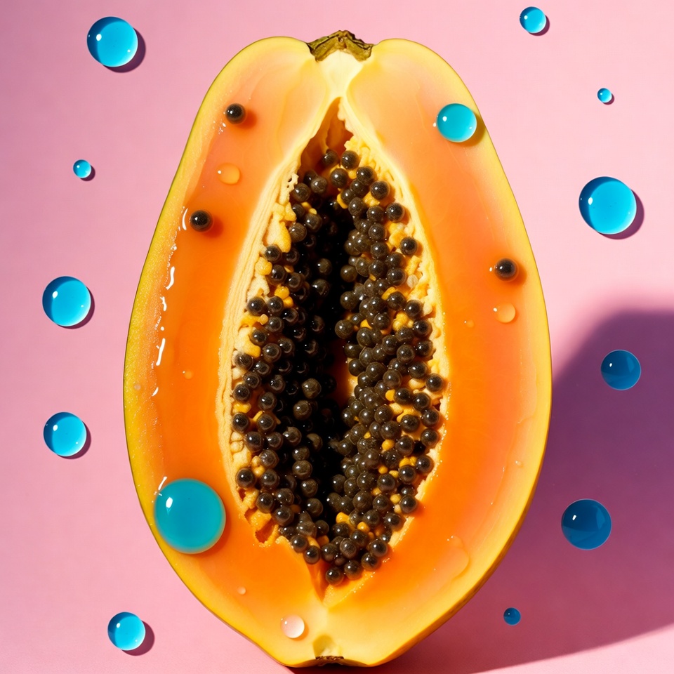 A ripe papaya is sliced open, revealing black seeds in the center surrounded by orange flesh. Shiny blue water droplets adorn the fruit and float around it. The composition is set against a vibrant pink background.
