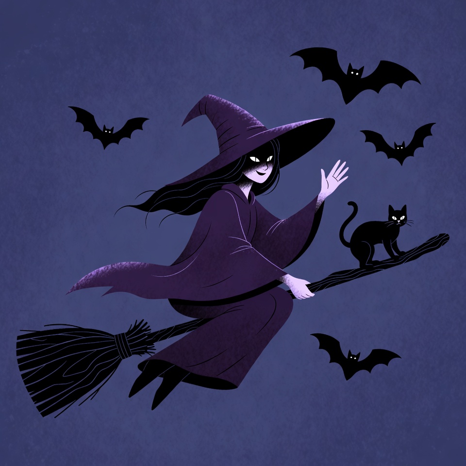 A cartoon witch with long dark hair and a wide-brimmed hat flies on a broomstick holding a black cat. She wears a flowing purple robe and raises one hand amid flying black bats. The scene is set against a dark purple background.