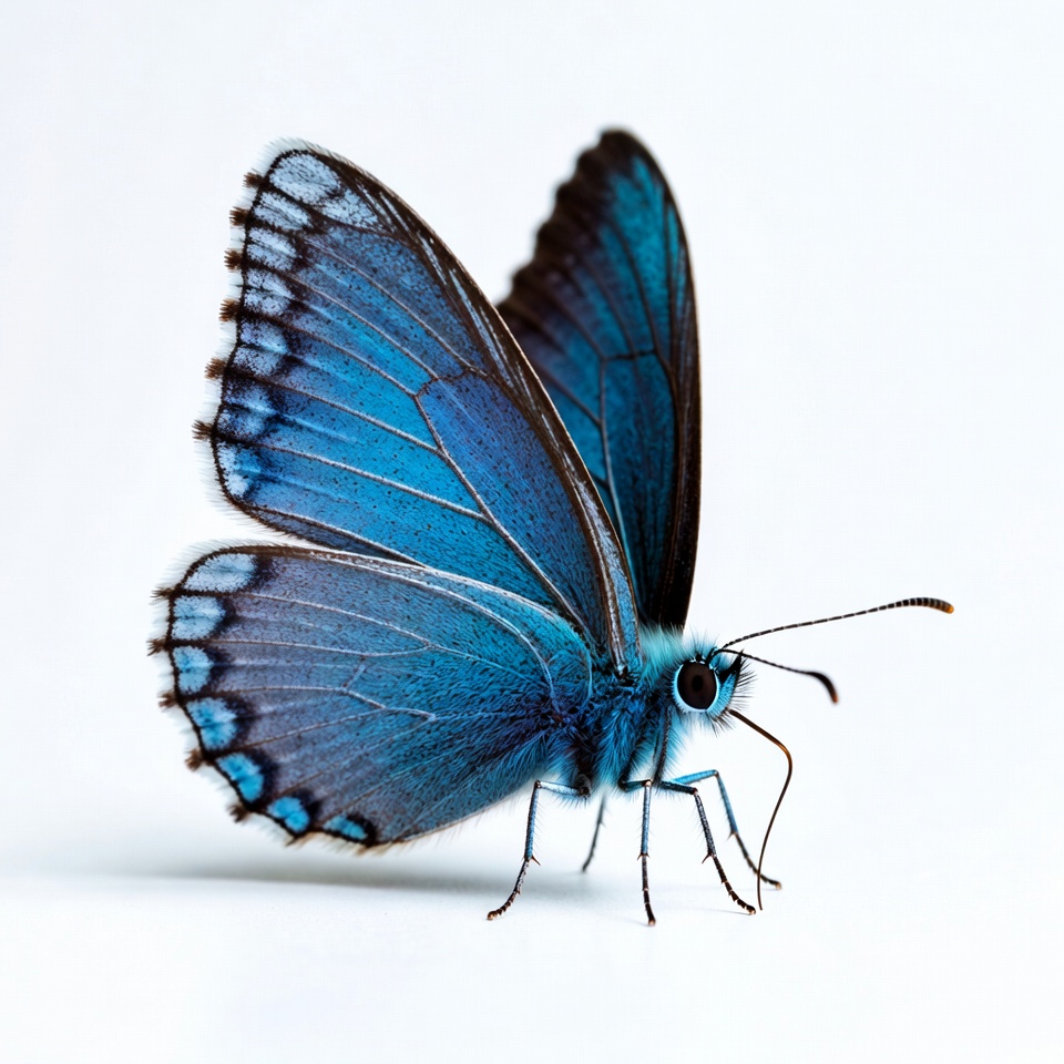 A vibrant blue butterfly with detailed wings spreads its wings while perched on a plain white background. The butterfly features black edges on its wings and fuzzy body with prominent antennae. Its wings display intricate patterns in shades of blue.