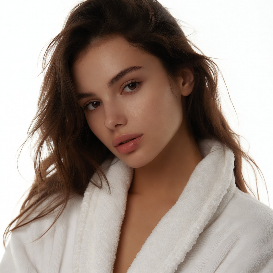 A young woman with long wavy brown hair gazes at the camera with a subtle expression. She wears a fluffy white bathrobe slightly open at the neckline. The portrait is set against a plain white background.