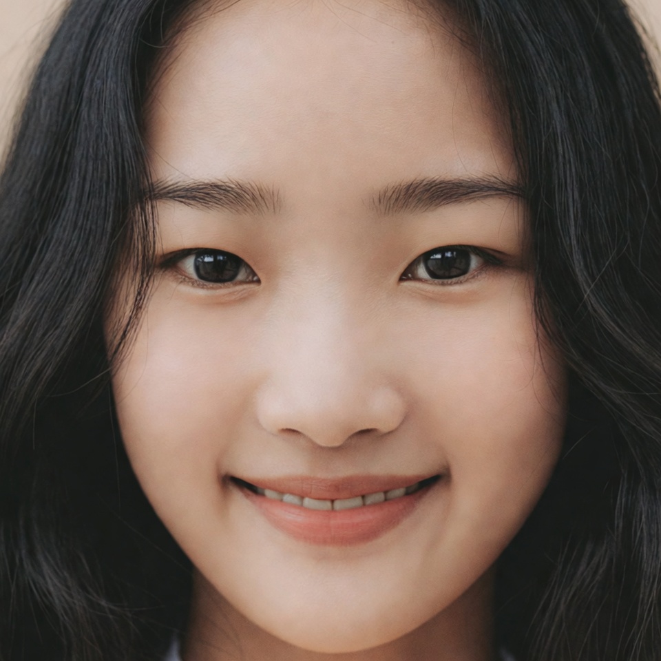 A young Asian woman with long straight black hair smiles gently at the camera in a close-up portrait. She has smooth fair skin, almond-shaped dark eyes, and subtle pink lips. Her face is centered against a plain light background.