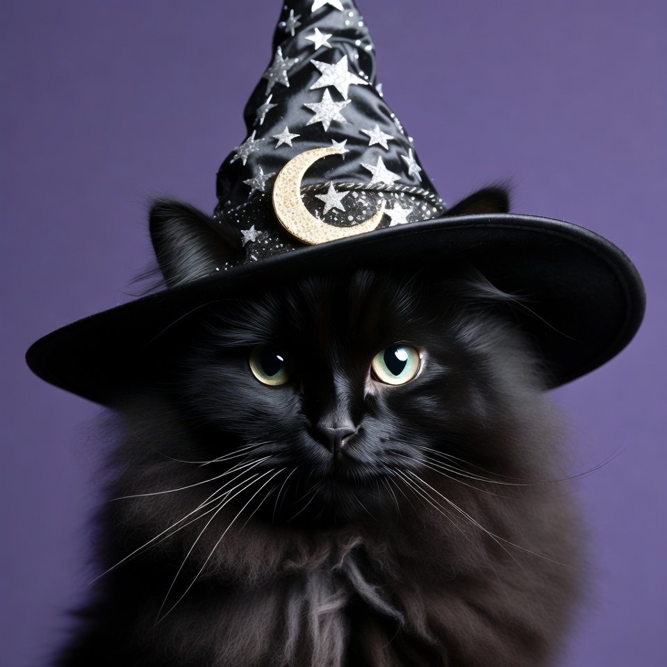 A fluffy black cat with green eyes wears a tall black witch hat adorned with silver stars and a gold crescent moon. The cat gazes directly at the camera against a vibrant purple background. Its fur is long and glossy, with prominent whiskers.