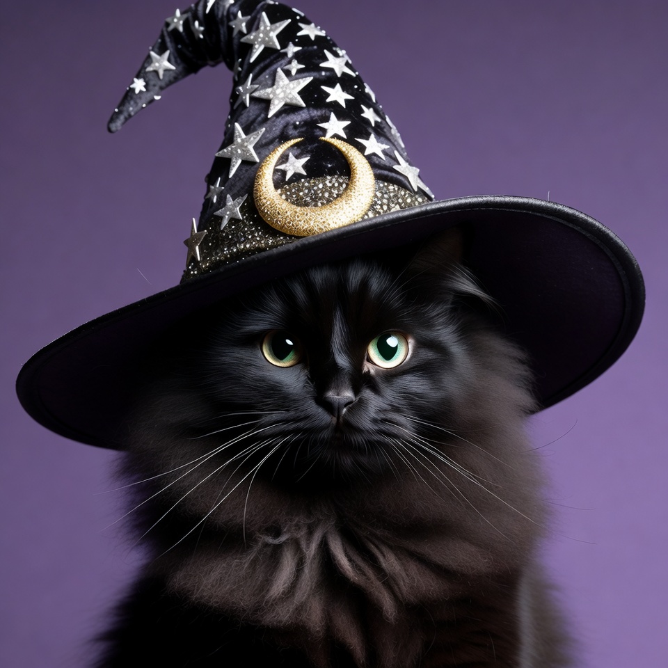 A fluffy black cat with green eyes wears a tall black witch hat adorned with silver stars and a gold crescent moon. The cat faces forward with a serious expression against a solid purple background. Its fur is long and dark, covering its face partially.