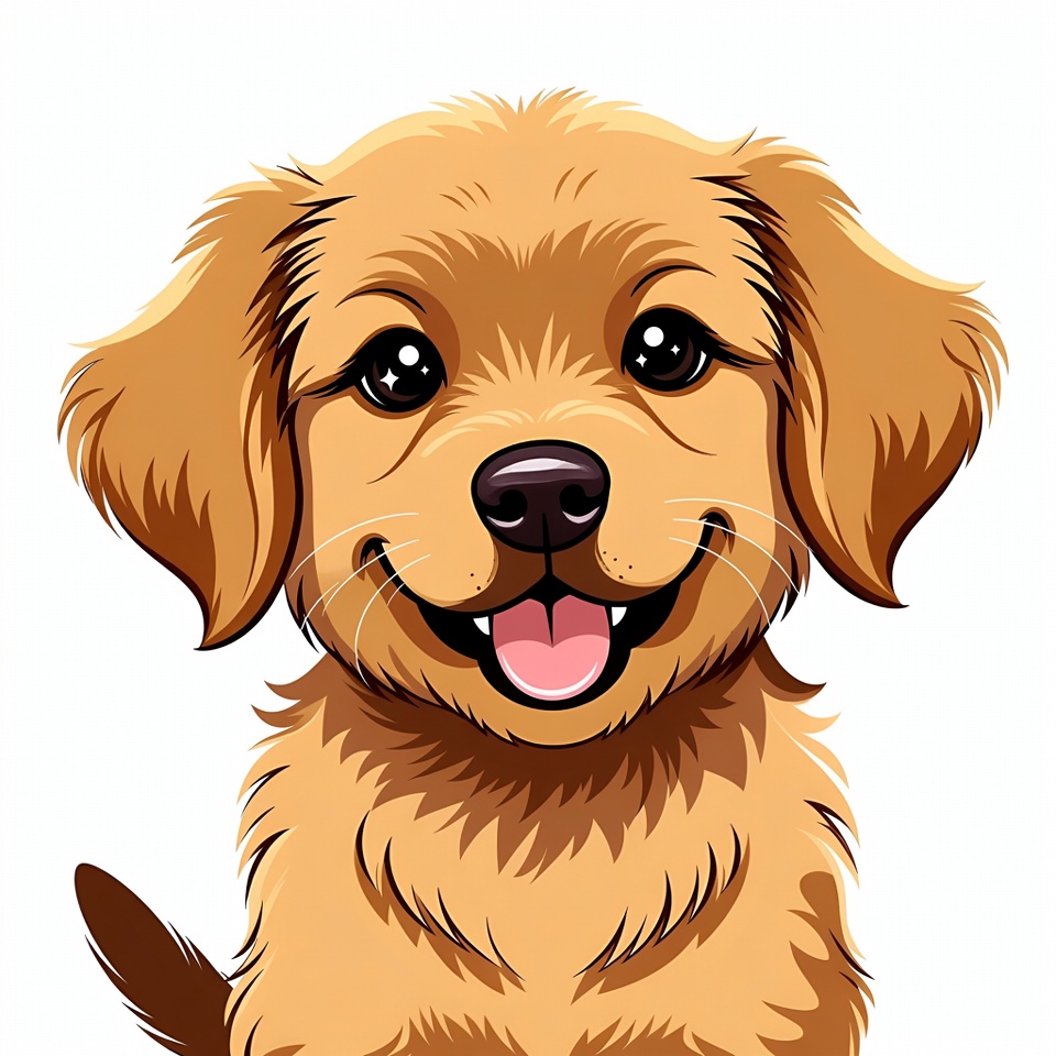 A fluffy golden retriever puppy with large sparkling eyes smiles happily on a white isolated background. The cartoon illustration features detailed fur texture, pink tongue, and black nose. The adorable pup sits with its tail visible.
