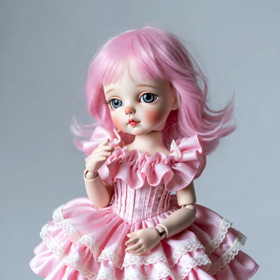 Pink-haired BJD doll in frilly dress