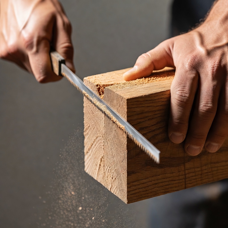 A man's hands grip a handsaw firmly as he cuts through a block of oak wood, producing sawdust. The wood shows a fresh cut with visible grain and splinters. The scene is set against a dark background, emphasizing the hands and tool.