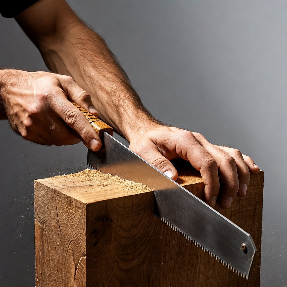 A man with muscular arms grips a handsaw firmly and cuts through a wooden block. Sawdust flies from the cut as the sharp blade slices into the light brown wood. The scene is set against a plain gray background.