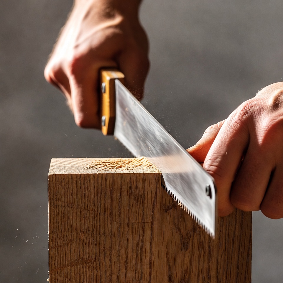 A man's hands grip a handsaw firmly as he cuts through a wooden block. Sawdust flies from the cut on the light-colored wood. The scene is set against a plain gray background.