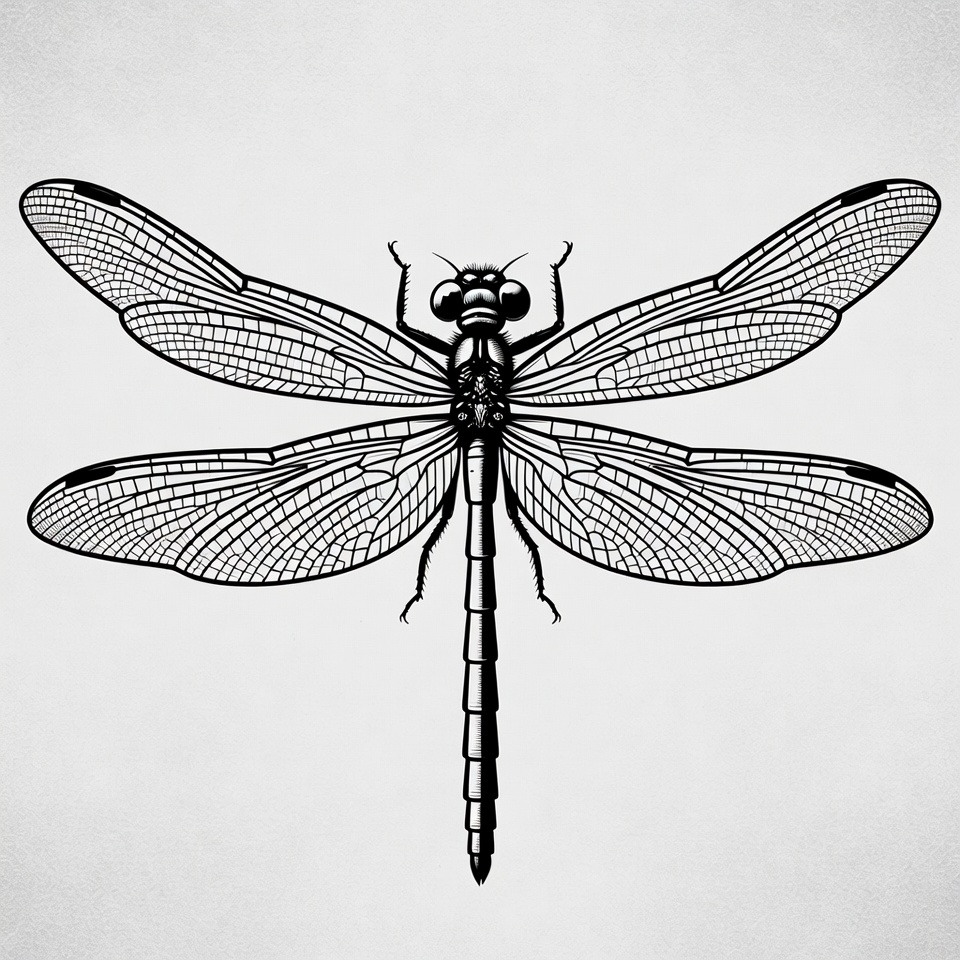 A detailed black silhouette of a dragonfly is depicted against a white background. The insect features intricate wing patterns, a slender body, and large compound eyes. It is shown in a top-down view with wings spread wide.