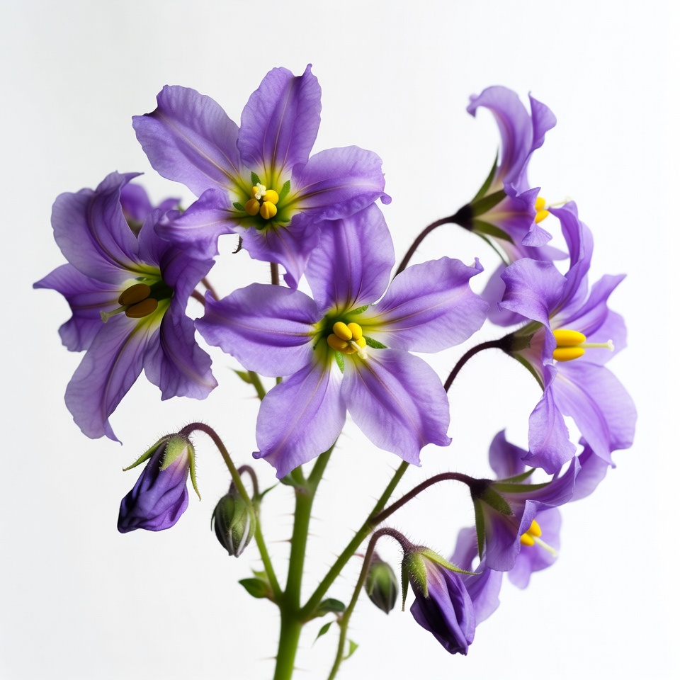 bloom, botany, bouquet, closeup, cluster, floral, flower arrangement, flowers, green stems, isolated, nature, petals, purple, ruffled petals, vibrant, white background, yellow centers, purple flowers