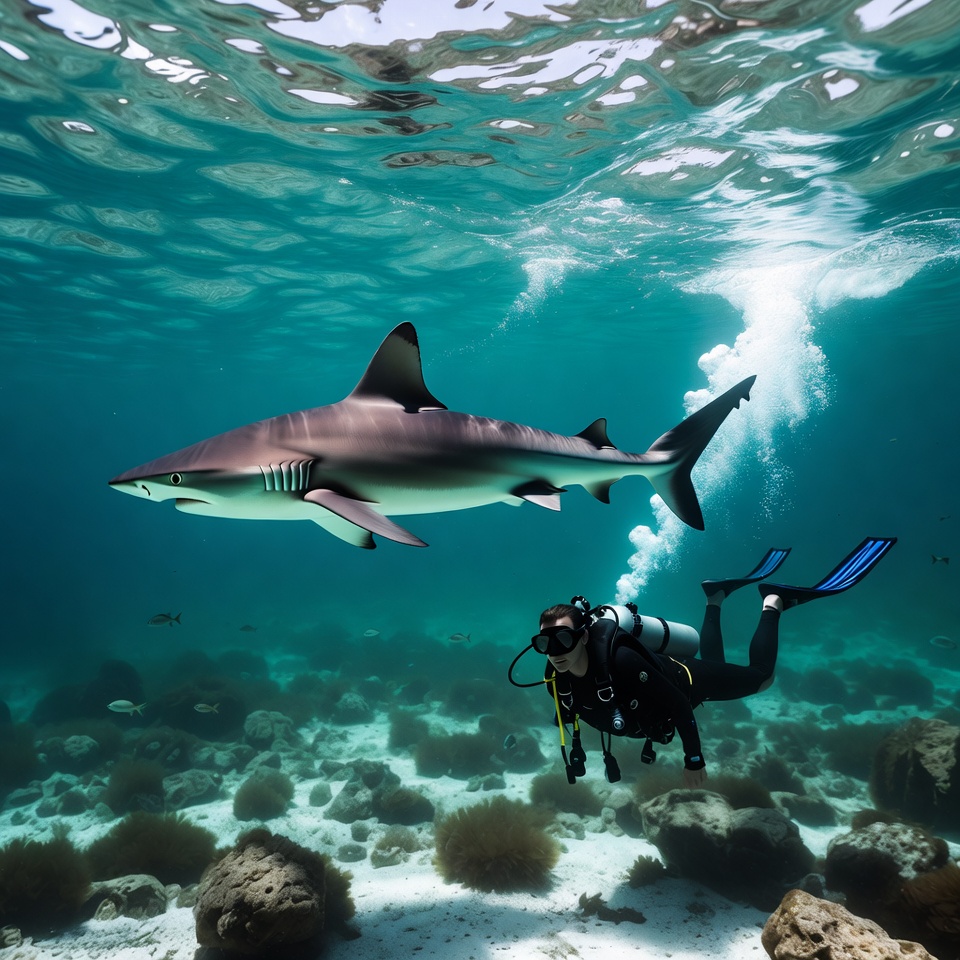 A scuba diver in a black wetsuit swims underwater near a blacktip reef shark in clear turquoise water. The shark glides gracefully with its distinctive black-tipped fins while the diver kicks with yellow flippers amid coral rocks and small fish. Bubbles rise from the diver's regulator in the vibrant ocean environment.