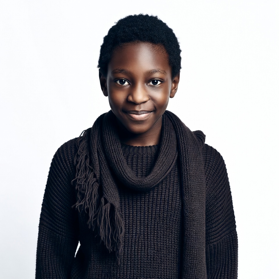 A young African boy with short curly black hair smiles at the camera against a white background. He wears a dark knit sweater and a matching fringed scarf draped around his neck. His expression is gentle and friendly.