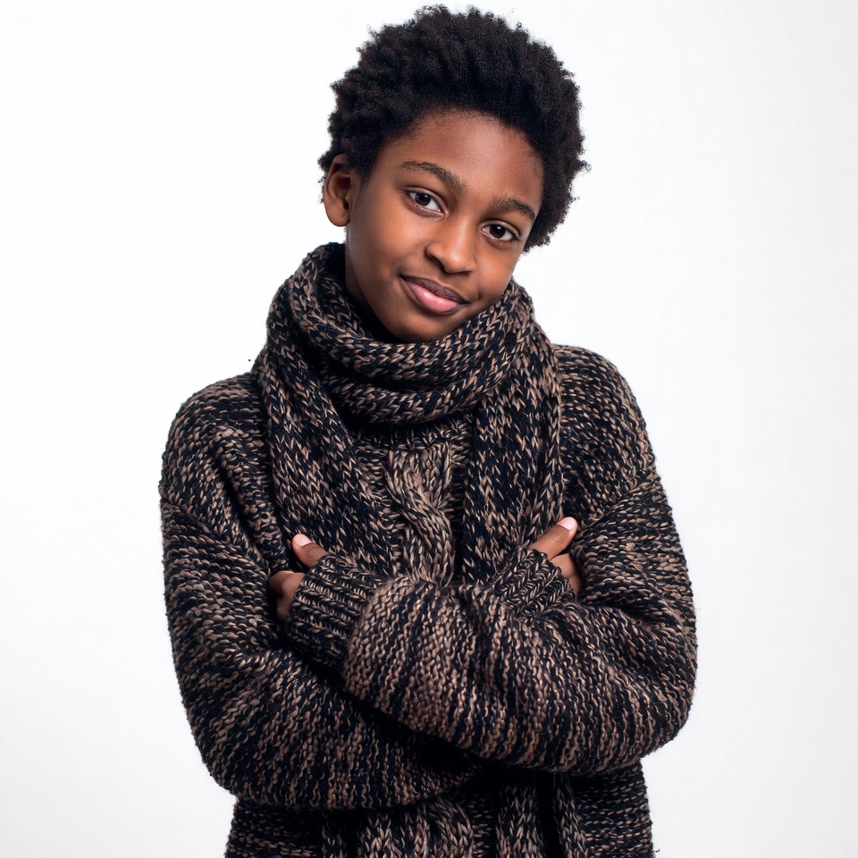 A young African-American boy with short curly black hair stands against a white background. He wears a brown knit sweater and matching scarf, with arms crossed over his chest. He has a slight smile and direct gaze at the camera.