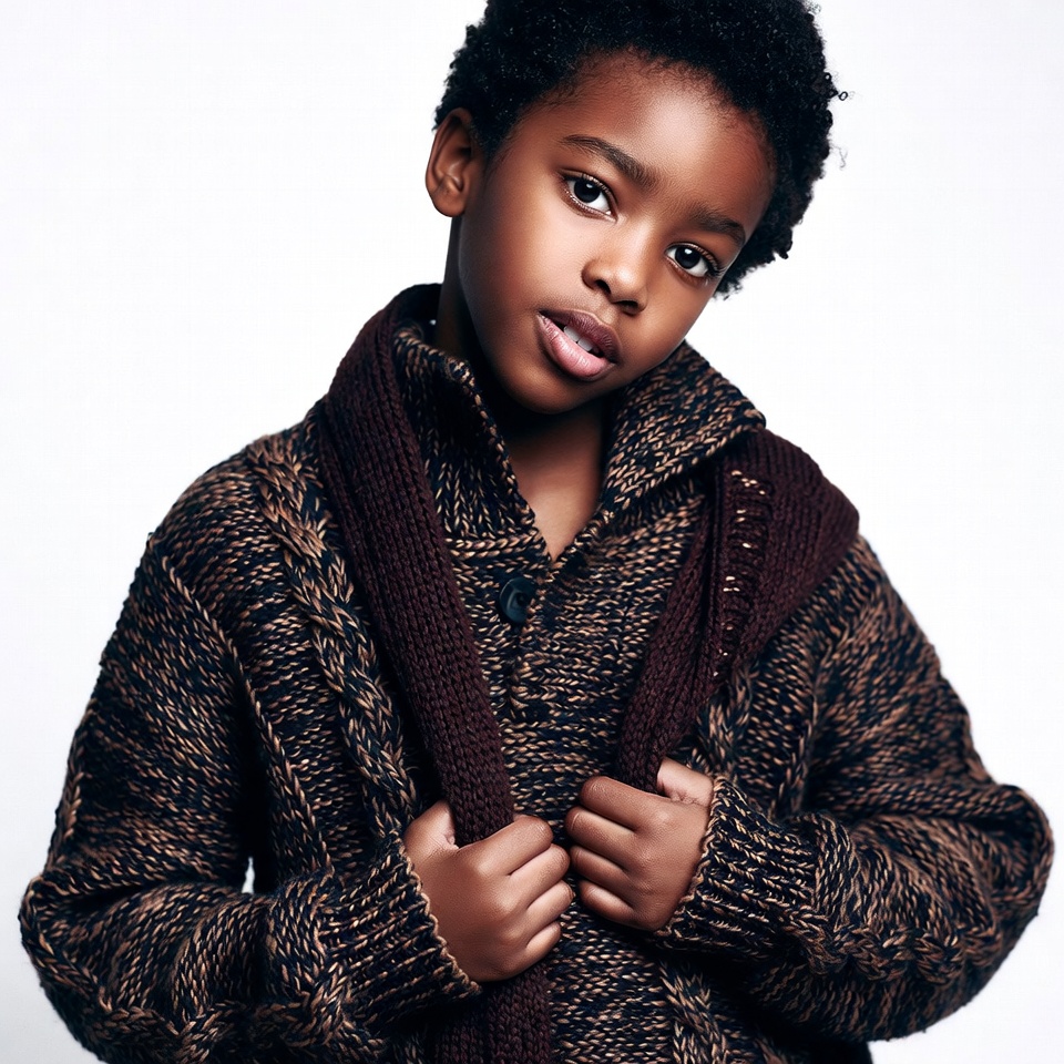 A young African-American boy with curly black hair stands against a white background. He wears a brown knit cardigan sweater with a maroon scarf draped around his neck. He holds the sweater closed with both hands and looks directly at the camera.